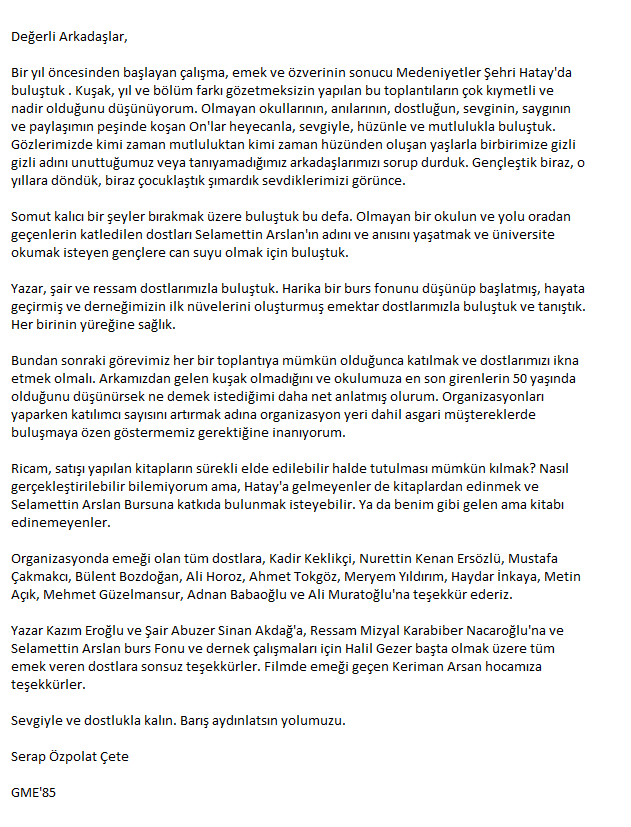 Başta Halil ağbi, Şeref ağbi, Çakmakçı, Melek, Dursun, Seydi, Birol ve Zihni olmak üzere emeği geçenlere çok teşekkürler.